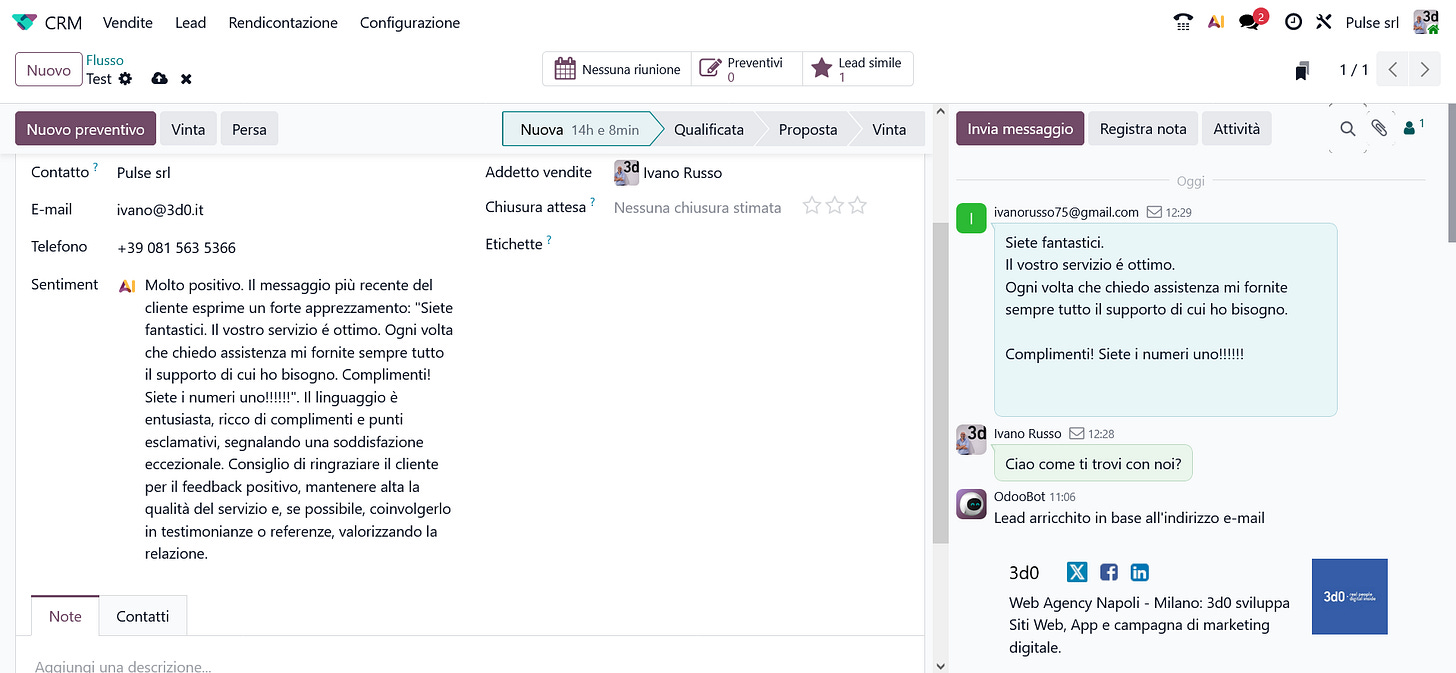 Ecco un esempio concreto e molto semplice di come sia possibile integrare un campo AI direttamente nella scheda Opportunità del CRM. Il sistema analizza automaticamente le comunicazioni con i nostri contatti, ne rileva il sentiment e suggerisce come impostare le prossime interazioni.